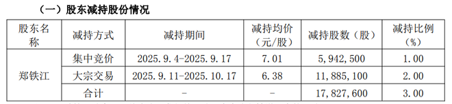 此前,百川股份于2025年8月13日披露了《关于大股东减持股份预披露公告》,公司大股东郑铁江计划自公告披露之日起15个交易日后的3个月内减持公司股份合计不超过17,827,680股(占公司总股本比例3.00%),其中:以集中竞价交易方式减持公司股份不超过5,942,560股(占公司总股本比例1.00%),以大宗交易方式减持公司股份不超过11,885,120股(占公司总股本比例2.00%)。公司于近日收到大股东郑铁江出具的《关于股份减持计划完成的告知函》,获悉本次股份减持计划已实施完毕。