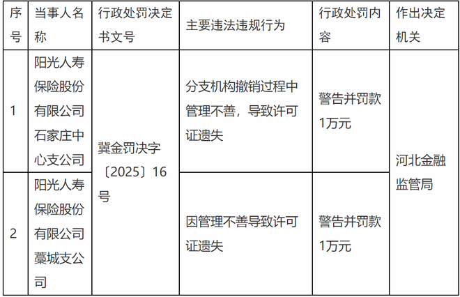 10月17日,国家金融监督管理总局河北监管局发布的行政处罚信息显示,因分支机构撤销过程中管理不善,导致许可证遗失,阳光人寿保险股份有限公司石家庄中心支公司被警告并罚款1万元;因管理不善导致许可证遗失,阳光人寿保险股份有限公司藁城支公司被警告并罚款1万元。