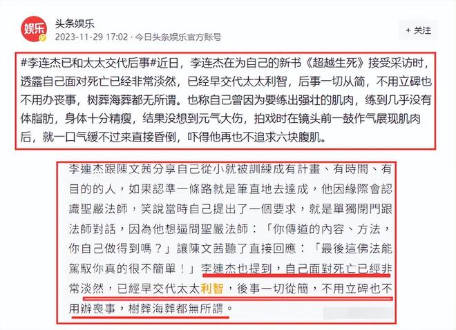 当时李连杰已经提前安排好后事的消息一经曝光,就引发了巨大关注。