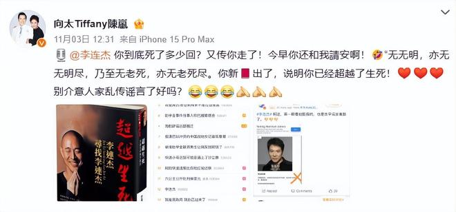 也正是因为身体健康原因,近些年,他多次被传去世。以至于他不得不多次辟谣。就连他的好友向太都忍不住发文:李连杰,你到底死了多少回?又传你走了!