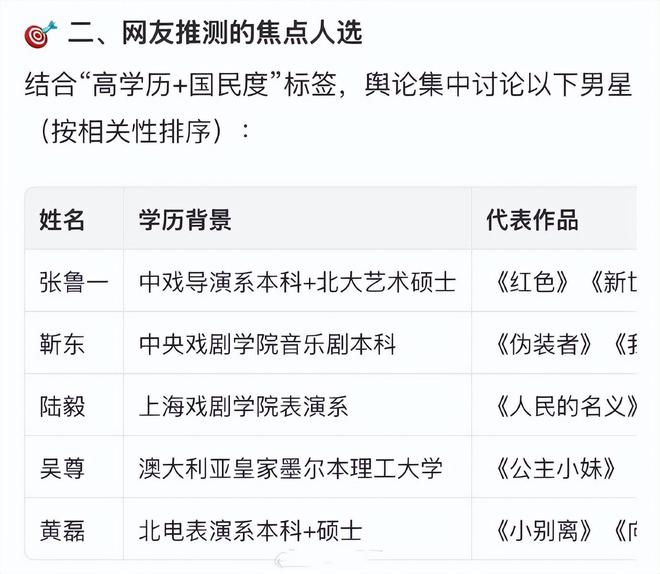 于是根据已婚、形象正面、高学历等信息,张鲁一、靳东、陆毅、吴尊、黄磊等男明星都被网友提名了。
