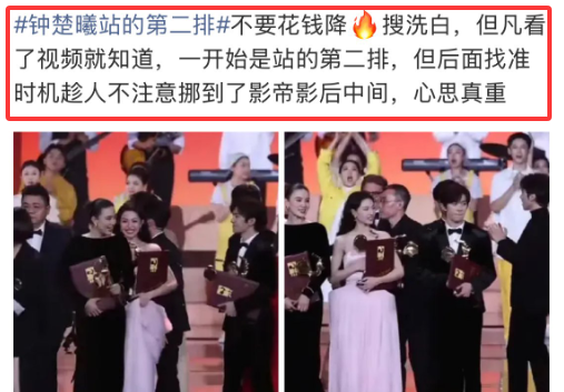 之前VOGUE盛典钟楚曦在合影环节抢C位引发争议,被网友一顿吐槽,虽然后来有公关营销替她说话,但效果其实并不大。这次金鸡奖颁奖典礼,钟楚曦凭电影《好东西》获得金鸡奖最佳女配角,到了大合影环节又抢C位争议。有网友diss她飘了,心机叵测,又开始抢C位了,居然站到了影后宋佳和影帝易烊千玺的中间,抢C位抢上瘾了。