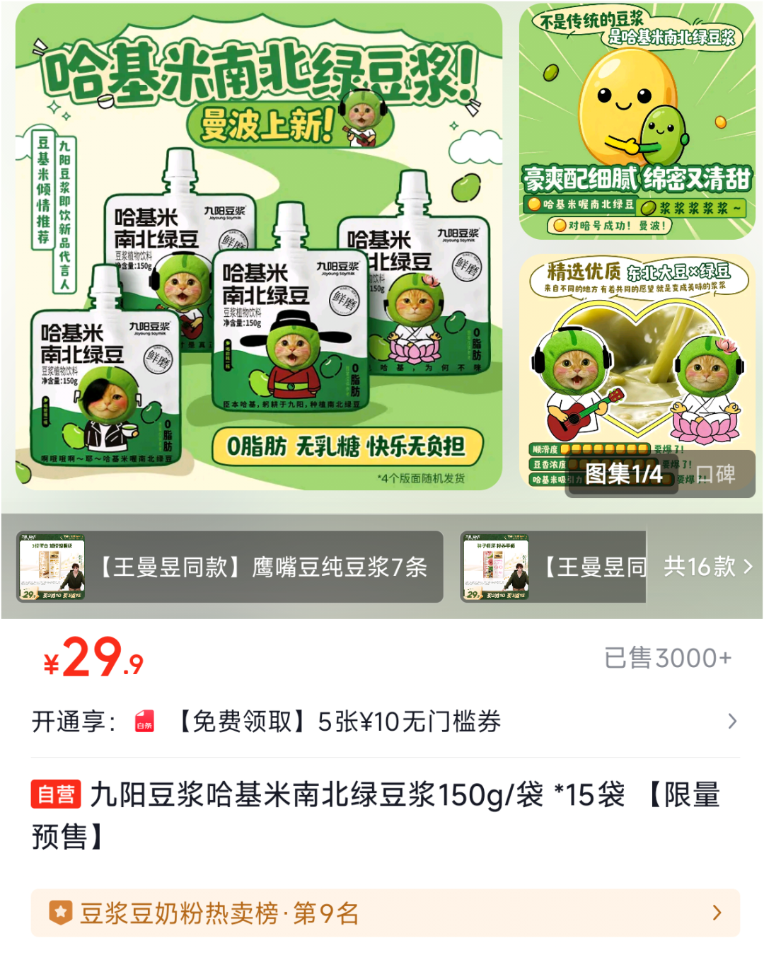 产品详情页显示,这款限量发售的植物蛋白饮料配料就是常见的大豆、绿豆、水、白砂糖和冰糖,定价相对较低,15袋仅售29.9元。只不过,它在文案上打出“哈呀库曼波好喝”的口号,同时将橘猫与绿豆元素融合,命名为“豆基米”,作为形象大使。字里行间,都体现出设计者对于“哈基米”梗烂熟于心。