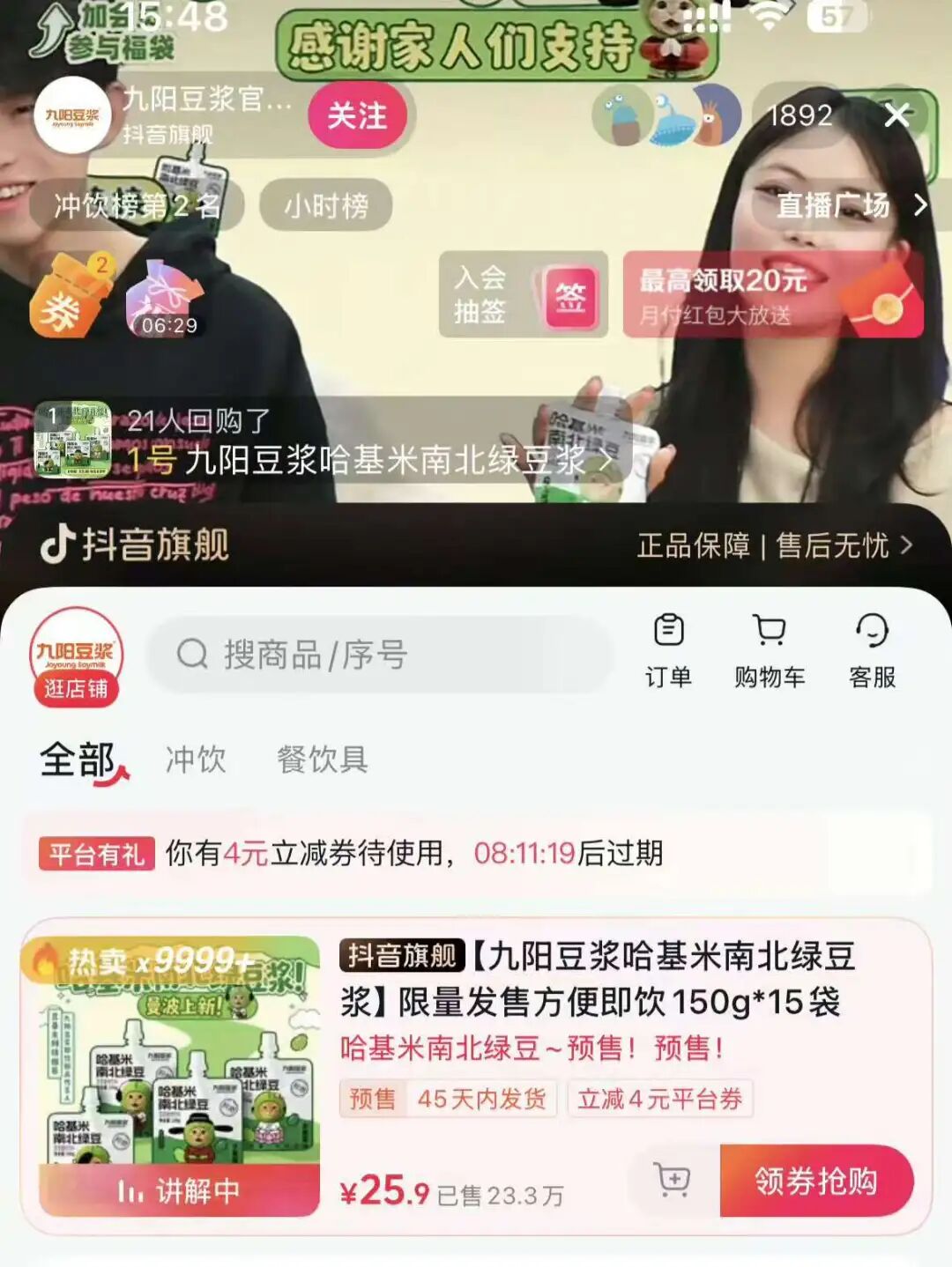 哈基米南北绿豆浆上线3天,在淘宝官方旗舰店已售10万+,拼多多平台截至11月13日,九阳豆浆官方旗舰店显示已拼102万袋,抖音直播间在没有视频预热、没有使用商品卡,纯免费流量的情况下,一天销售20万单,上架即爆单。