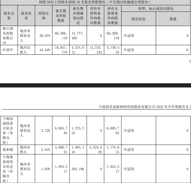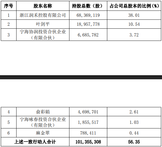 据公司半年报,浙江润禾控股有限公司、叶剑平、宁海协润投资合伙企业(有限合伙)、俞彩娟、宁海咏春投资合伙企业(有限合伙)依次为公司前五大股东。