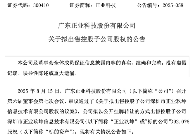 正业科技(300410)8月15日晚间公告,为了优化资源配置,公司拟以公开挂牌转让方式,出售控股子公司深圳市正业玖坤信息技术有限公司(简称“正业玖坤”)92.07%股权,挂牌转让底价为10万元。