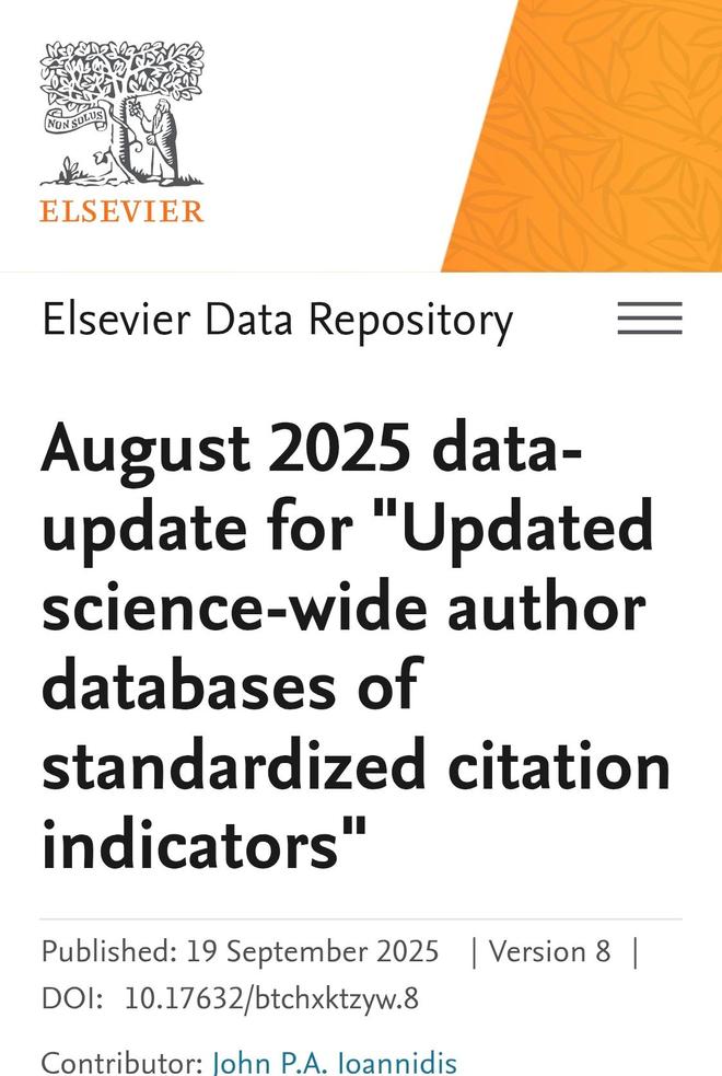 该榜单分为“终身科学影响力排行榜”和“年度科学影响力排行榜”两个部分,从全球近700万名科学家中,基于总引用量、H指数((全称“H-index”,用于评估科研人员的学术产出数量与学术产出水平)、合著者修正的HM因子、单独作者或第一作者引用数等多项指标进行综合评估,遴选出全球排名前2%的顶尖学者,覆盖22个主学科与174个子学科,被广泛视为衡量科研工作者长期影响力和年度表现的重要标准。