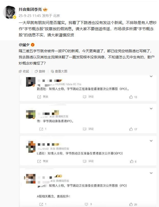 抖音集团副总裁李亮在微博回应表示:“一大早就有朋友问是否属实。我看了下路透也没有发这个新闻。不排除是有人想炒作‘字节概念股’故意放的假消息。”