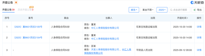 值得一提的是,天眼查诉讼信息显示,2025年以来,中汇人寿以被告身份涉案数量已达39起,数量超过去年33起。案由主要集中在人身保险合同纠纷、人寿保险合同纠纷、保险纠纷、健康保险合同纠纷等,此外还涉及部分劳动合同纠纷及合同纠纷。