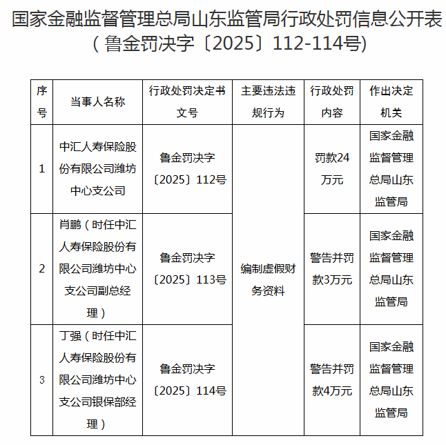 9月26日,山东金融监管局披露的行政处罚信息显示,因编制虚假财务资料,中汇人寿保险股份有限公司潍坊中心支公司被罚款24万元;时任副总经理的肖鹏、银保部经理丁强分别被警告并罚款3万元、4万元。