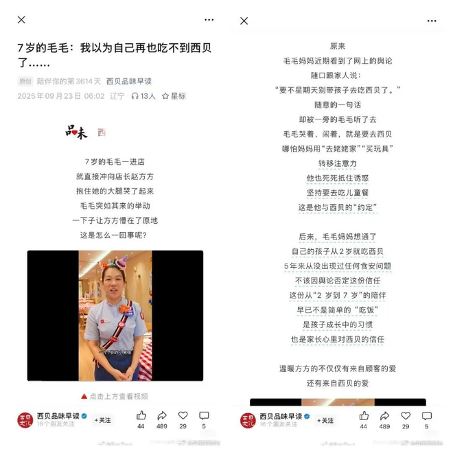 9月23日,名为“西贝风味早读”的公众号,发布文章《7岁的毛毛:我以为我再也吃不到西贝了……》。文章以7岁儿童毛毛的视角,讲述了毛毛从2岁起开始吃西贝,妈妈因为最近的新闻不让毛毛再去,毛毛哭着、闹着,哪怕妈妈用玩具“诱惑”,也要遵守与西贝的“约定”,最后妈妈想通了“不该因舆论否定这份信任”。