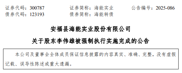 9月29日,海能实业(300787)发布公告,公司第三大股东李伟雄因强制执行被国家税务总局龙岩市税务局稽查局依法处置其持有的公司股票1038.05万股,处置期间为2025年9月15日至2025年9月25日。近期公司收到通知,李伟雄所持的股票已全部处置完毕。