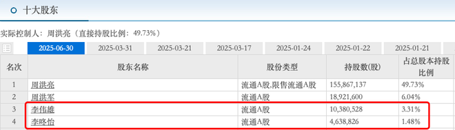 截至2025年6月30日,李伟雄和李咚怡分别持有公司股份10,380,528股(持股占比3.31%)和 4,638,826股(持股占比1.48%),这意味着,两股东所持全部股份已彻底被“清空”。