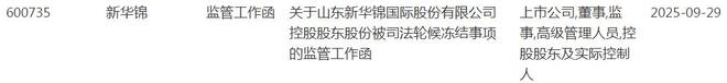 9月29日,上交所官网显示,因涉及公司控股股东股份被司法轮候冻结事项,ST新华锦(600735)收到监管工作函。