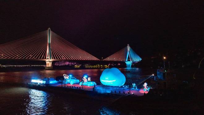 船身上搭载的单车、顺风车、租车巨型装置,不只是品牌元素的堆砌,它更像一个立体广告牌,把单车、顺风车、租车模型同时展示,本质上是用视觉符号告诉沿岸城市:“看,我们什么出行服务都有”。这比喊口号“我们是全场景出行平台”更有说服力。