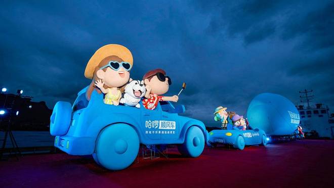 一艘游船正缓缓驶过,甲板上立着巨型的哈啰单车、哈啰租车、哈啰顺风车装置,蓝色的身影在江风中格外醒目。