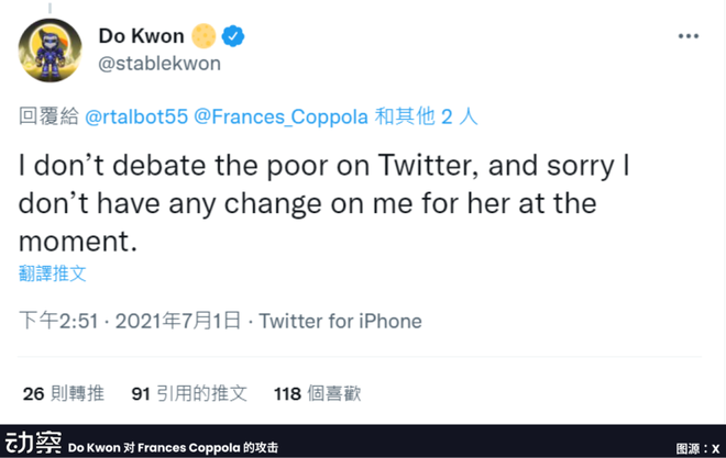 2021 年 7 月,当英国经济学家 Frances Coppola 在推特上批评算法稳定币的设计缺陷时,Do Kwon 回应道:“我不与穷人辩论,抱歉我现在身上没有零钱施舍她。”