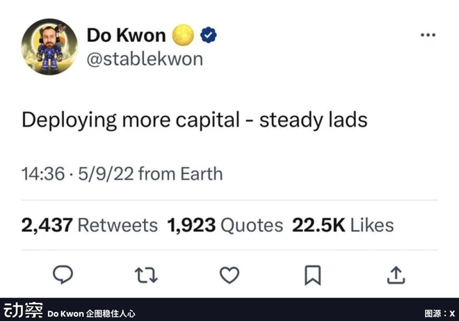 UST 的价格开始出现波动,从 1 美元的锚定价格下跌。5 月 8 日,UST 跌破了 0.99 美元这个重要的心理关口。面对危机,Do Kwon 在推特上发布了一条现在看来极其讽刺的消息:“Deploying more capital - steady lads(正在部署更多资金——稳住,伙计们)”。