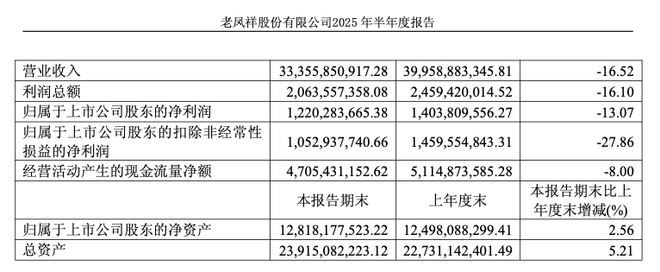 资料显示,老凤祥主要从事黄金珠宝首饰、工艺美术品、笔类文教用品的生产经营及销售。今年上半年,公司实现营业收入333.56亿元,同比下降16.52%;利润总额20.64亿元,同比下降16.10%;归属于母公司股东的净利润12.20亿元,同比下降13.07%;扣非净利润10.53亿元,同比降幅达27.86%。