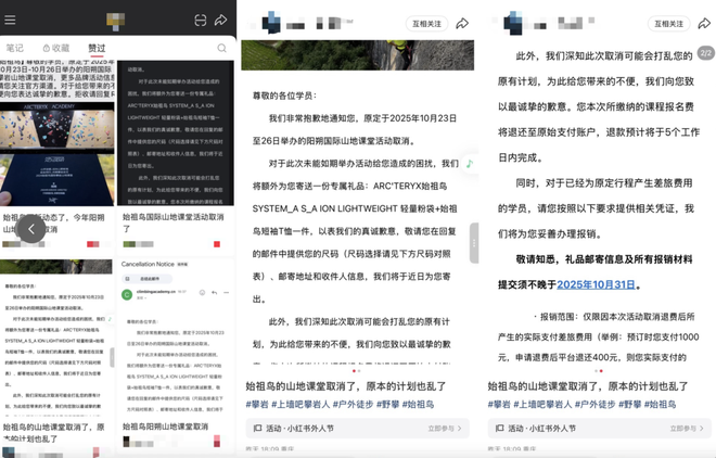 10月9日,多位网友发帖称收到始祖鸟官方发送的短信及邮件:原定于2025年10月23日-10月26日举办的阳朔国际攀岩山地课堂取消。始祖鸟将退还课程报名费,并为学员提供原定行程的差旅费用报销及专属礼品。