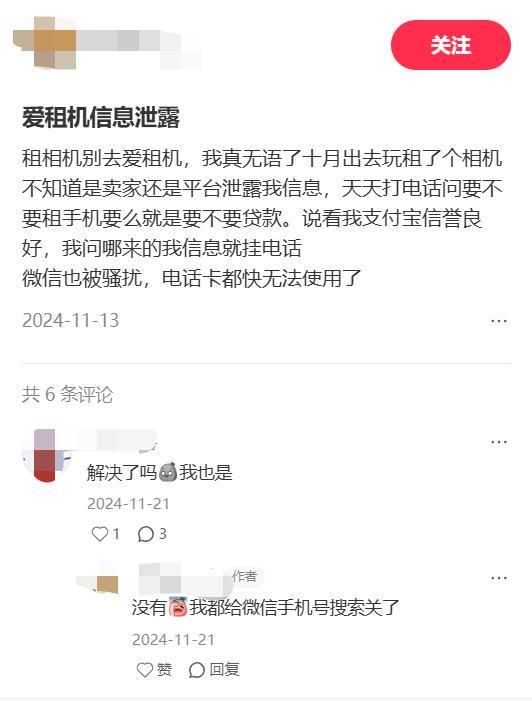 曾有网友提到,自己在爱租机租过一次相机后,经常接到陌生电话问要不要办贷款、租手机,微信也被骚扰,最后不得已关掉了微信手机号搜索。黑猫投诉平台还有用户提到,有些商家会擅自收集、过度收集消费者的情况,要求租客出示身份证正反面照片、甚至社保信息。