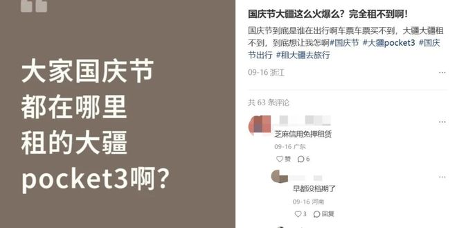 国庆前夕,"一生要出片"的年轻人四处搜寻得力的"拍照搭子",那些携带方便、滤镜强大的热门相机都在被争先预定;不少网友在社媒平台上吐槽,在租赁平台上找很多商家想租大疆Pocket3,但全都没档期了,"车票买不到,相机现在也这么难租。"