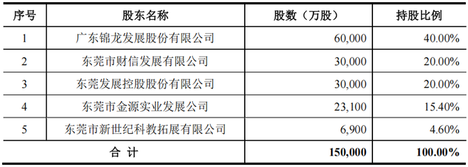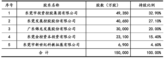 2014年10月改制为股份公司之后,东莞证券的股权结构变更为广东锦龙发展股份有限公司(以下简称"锦龙股份")持股40%、东莞市财信发展有限公司持股20%、东莞发展控股股份有限公司持股20%、金源实业持股15.40%、东莞市新世纪科教拓展有限公司持股4.60%。