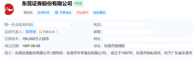 天眼查信息显示,东莞证券成立于1997年6月9日,注册资本15亿元,法定代表人是陈照星,他亦是东莞证券的董事长。