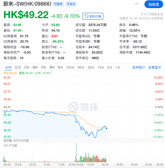 截至发稿,蔚来-SW(HK:09866)跌逾9%报49.22港元。