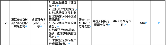 10月15日,中国人民银行湖州市分行行政处罚决定信息公示表(湖银罚决字〔2025〕28-39号)显示,浙江安吉农村商业银行股份有限公司因6项违规行为,被警告并处165.7万元罚款;10名相关责任人同步被追责,罚款金额从0.5万元至1万元不等。