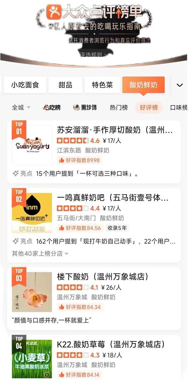 「创业最前线」将大众点评地址定位到一鸣食品温州的大本营,一鸣食品在酸奶鲜奶好评榜排名第二,其还要与苏安溜溜·手作厚切酸奶、楼下酸奶、K22.酸奶草莓等竞争。