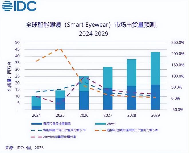 来自IDC的数据显示,2025年第一季度,中国智能眼镜市场出货量为49.4万台,同比增长116.1%。据IDC预测,2025年中国智能眼镜市场出货量将达到290.7万台,同比增长121.1%。