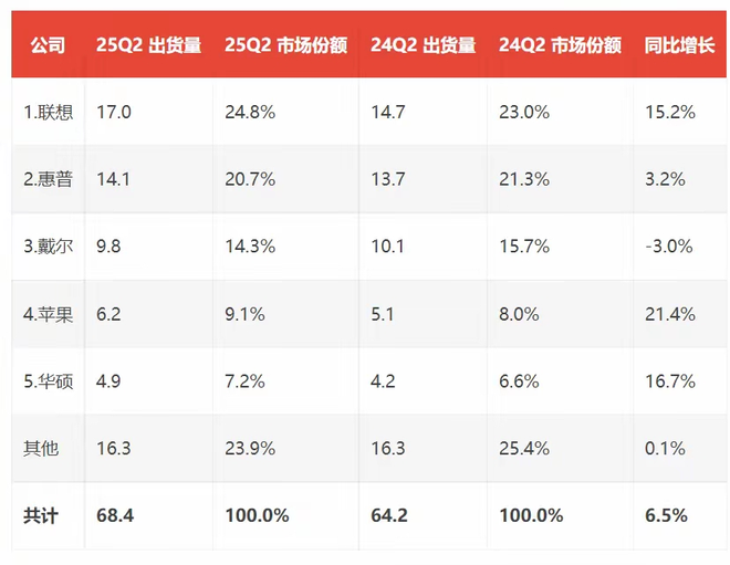 市场调查机构 IDC 近期发布的报告称,在 2025 年第 2 季度,全球 PC 出货量达到 6840 万台,同比增长 6.5%。其中联想的出货量 达到1700 万台,市场份额 24.8%,同比增长 15.2%,可谓拔得头筹。