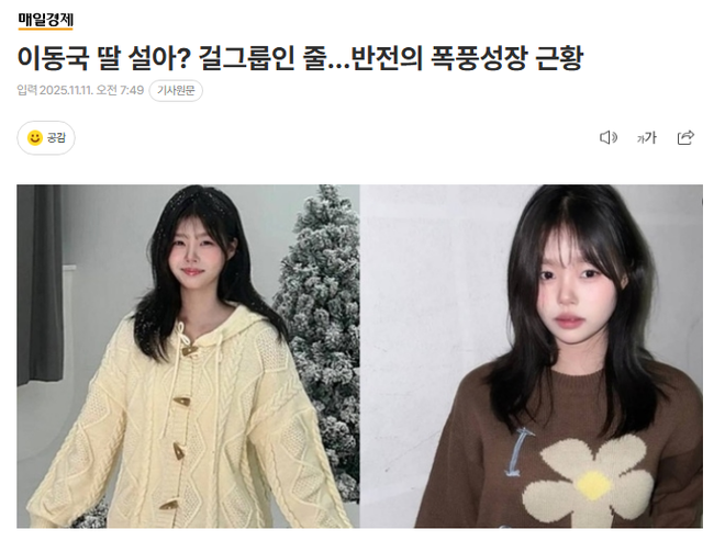 韩国前足球名将李同国一家一直备受关注。近日,李同国的妻子李秀珍通过个人社交媒体账号晒出了三女儿雪雅的近照,配文:“三女儿♥。”
