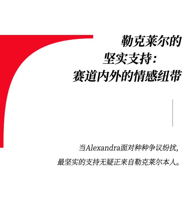 勒克莱尔多次在公开场合强调,Alexandra在他的生活和职业生涯中都扮演着重要角色。“她显然是我生活中非常重要的一部分,而且在我的职业生涯和应对起伏的方式中也是如此。”这种相互支持与理解,或许是Alexandra能够在舆论风暴中一直保持平静的底气所在。在F1这项高压力、高商业性的运动中,情绪稳定的她成为了勒克莱尔坚实的情感依靠(尤其今年法拉利车队成绩堪忧,伴侣的陪伴就更重要了)。