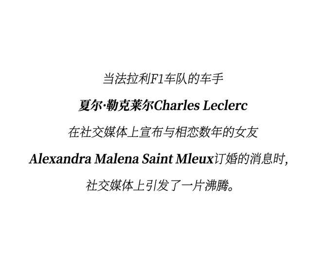 作为全球范围内拥有最多女车迷的F1车手之一,“乐扣”的一举一动都会引发热议。此番他直接丢出订婚“炸弹”,“Mr&Mrs Leclerc”的简单宣告,却让一众女车迷大呼“失恋”了。