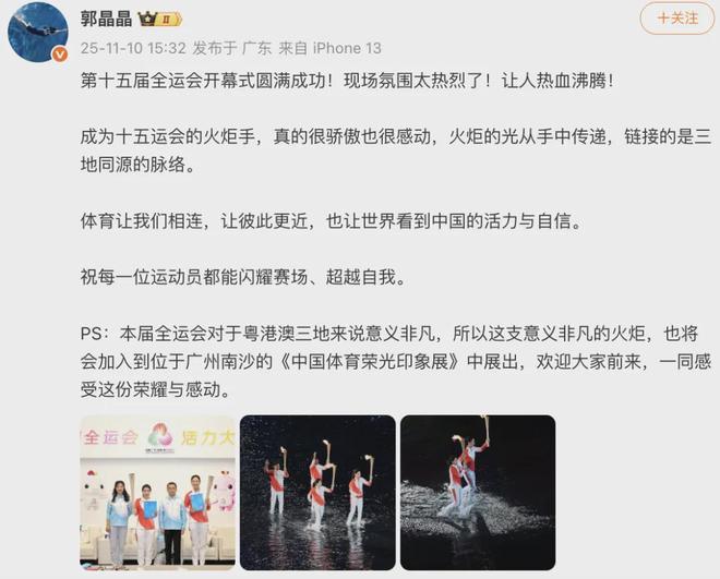 10日下午,郭晶晶晒出自己作为十五运会开幕式火炬手的图片,并配文“一场开幕,展现大国气派。一棒火炬,传递三地同源。一份自信,闪耀中国活力。”