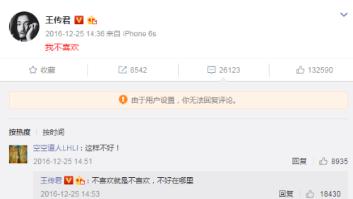 2016年底,电影《摆渡人》上映后口碑两极分化,王家卫几乎发动半个娱乐圈转发“我喜欢”。王传君那句逆流而上的“我不喜欢”被网友奉为“人间清醒”。