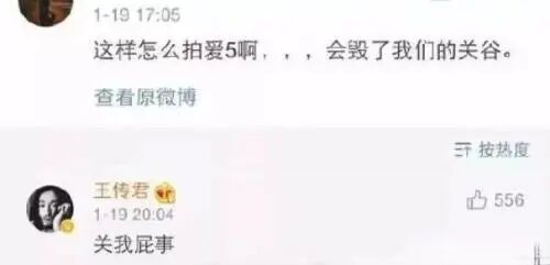 有一次,王传君发了一张生活照在微博上,评论里粉丝称他如今的形象“毁了关谷”,王传君回复四个字:“关我屁事。”