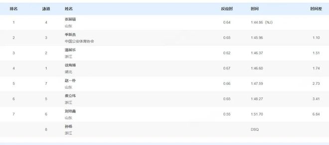11月12日晚,第十五届全运会游泳比赛继续在深圳大运中心游泳馆举行。在男子200米自由泳决赛中,张展硕斩获冠军,季新杰亚军,潘展乐季军。本场比赛,孙杨的成绩位列第八,显示DSQ(被取消比赛资格)。