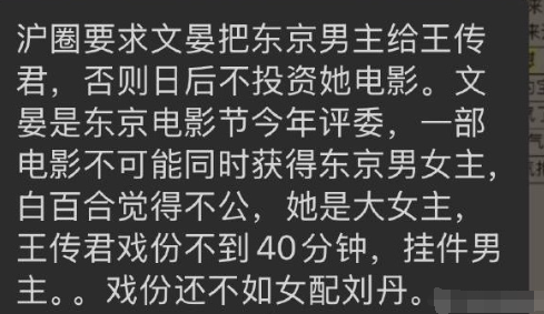 但有爆料称,沪圈资本施压评委文晏,要求将最佳男演员奖给《春树》的王传君,而同一部电影很难同时获得最佳男、女演员奖。