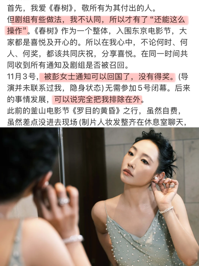 当时正值东京电影节颁奖,白姐主演的《春树》是唯一入围华语片,而她本人则是影后的 热门人选。