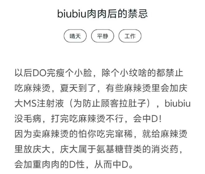 并且肉毒有着许多注意事项,言言的朋友这两天因为吃了麻辣烫全身过敏,医嘱注明不能吃牛肉等高致敏食物,但没想到这麻辣烫真材实料是牛骨汤熬得。