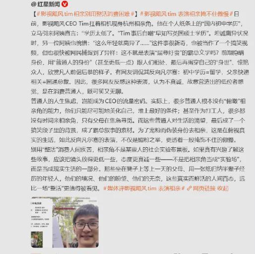 文章中,红星新闻称,有网友认为Tim的这种表演,是在消费普通人,既可笑又无聊。红星新闻还表示,普通人的人生焦虑,岂能成为CEO的流量密码。