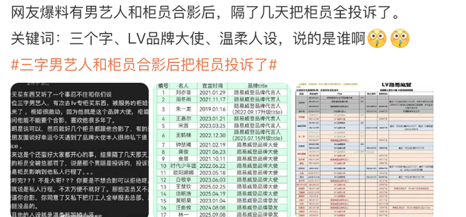 最近热搜上挂着“三字男艺人和柜员合影后把柜员投诉了”的瓜,是有网友发文吐槽某担任驴牌大使的三字男艺人,在其专柜购物时被柜员认出,柜员偷偷以粉丝身份请求合影,男艺人现场同意了并配合多位店员合影,随后柜员在朋友圈发文还夸了男艺人为人友善。隔几天后,之前合照的柜员全被总部处罚,原因是男艺人以“柜员影响私人行程”向总部投诉。
