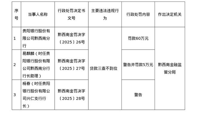 此外,时任贵阳银行股份有限公司黔西南分行行长助理易麒麟,被警告并处罚款5万元;时任贵阳银行股份有限公司兴仁支行行长杨春,被警告。