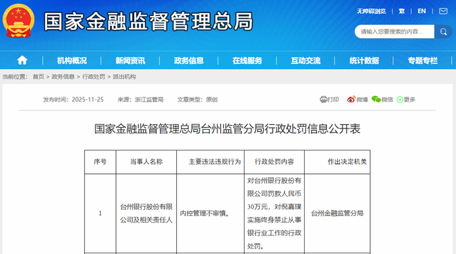 台州银行因内控管理不审慎被罚30万元,责任人遭终身禁业处罚