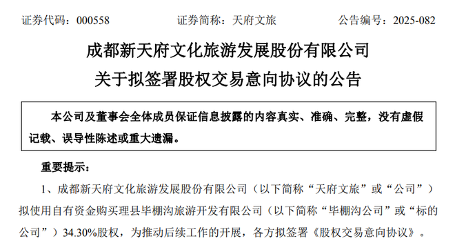11月24日晚间,天府文旅(000558)发布公告,公司拟使用自有资金购买理县毕棚沟旅游开发有限公司(以下简称“毕棚沟公司”)34.3%股权。
