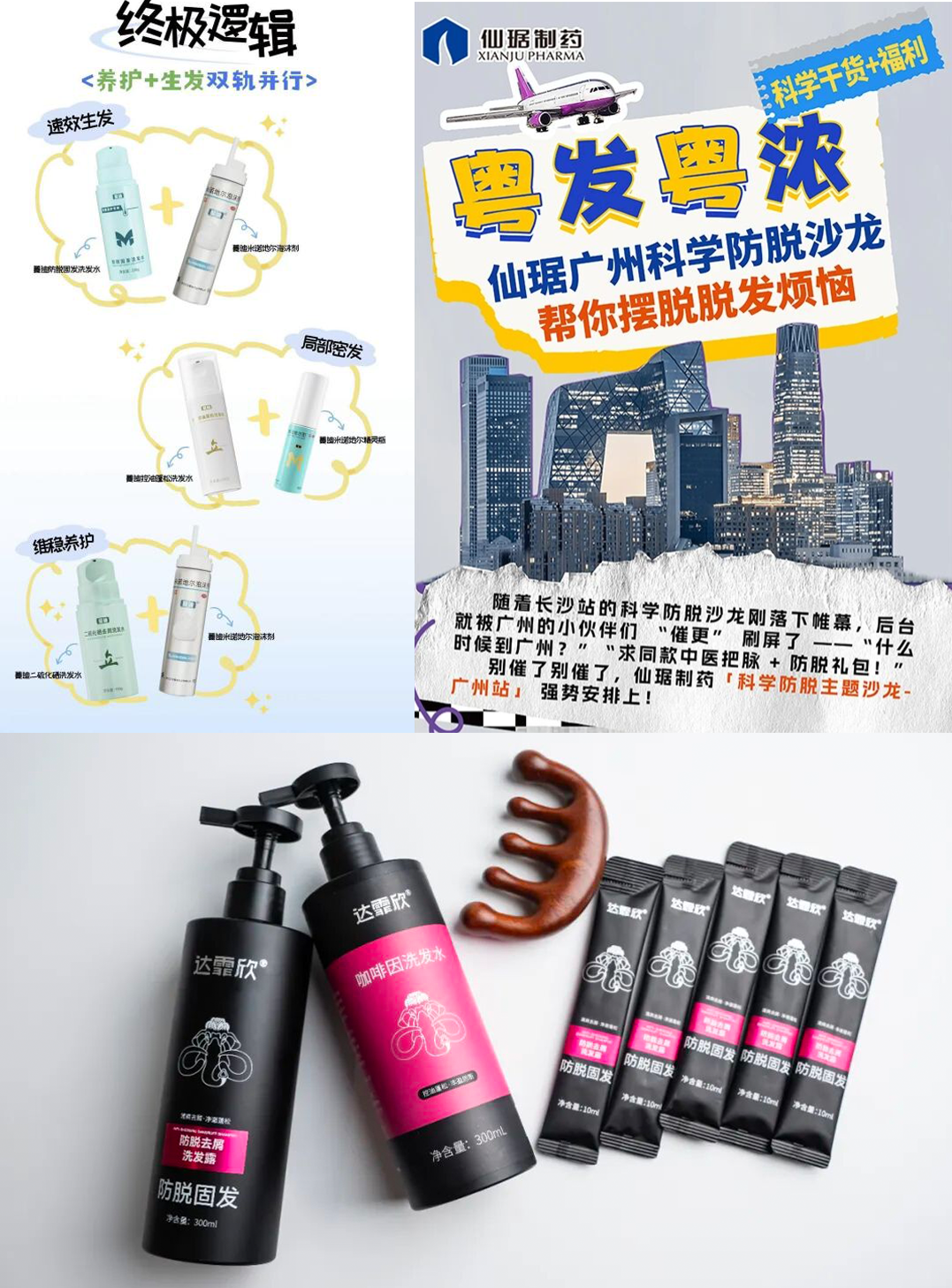 《FBeauty未来迹》发现,蔓迪、振东制药、仙琚制药均已推出“药品+妆品”的防脱产品组合,且在线下推广中以“科学防脱沙龙”的形式,将专业诊疗、知识科普、“药+妆”防脱产品结合起来,抢占消费心智。