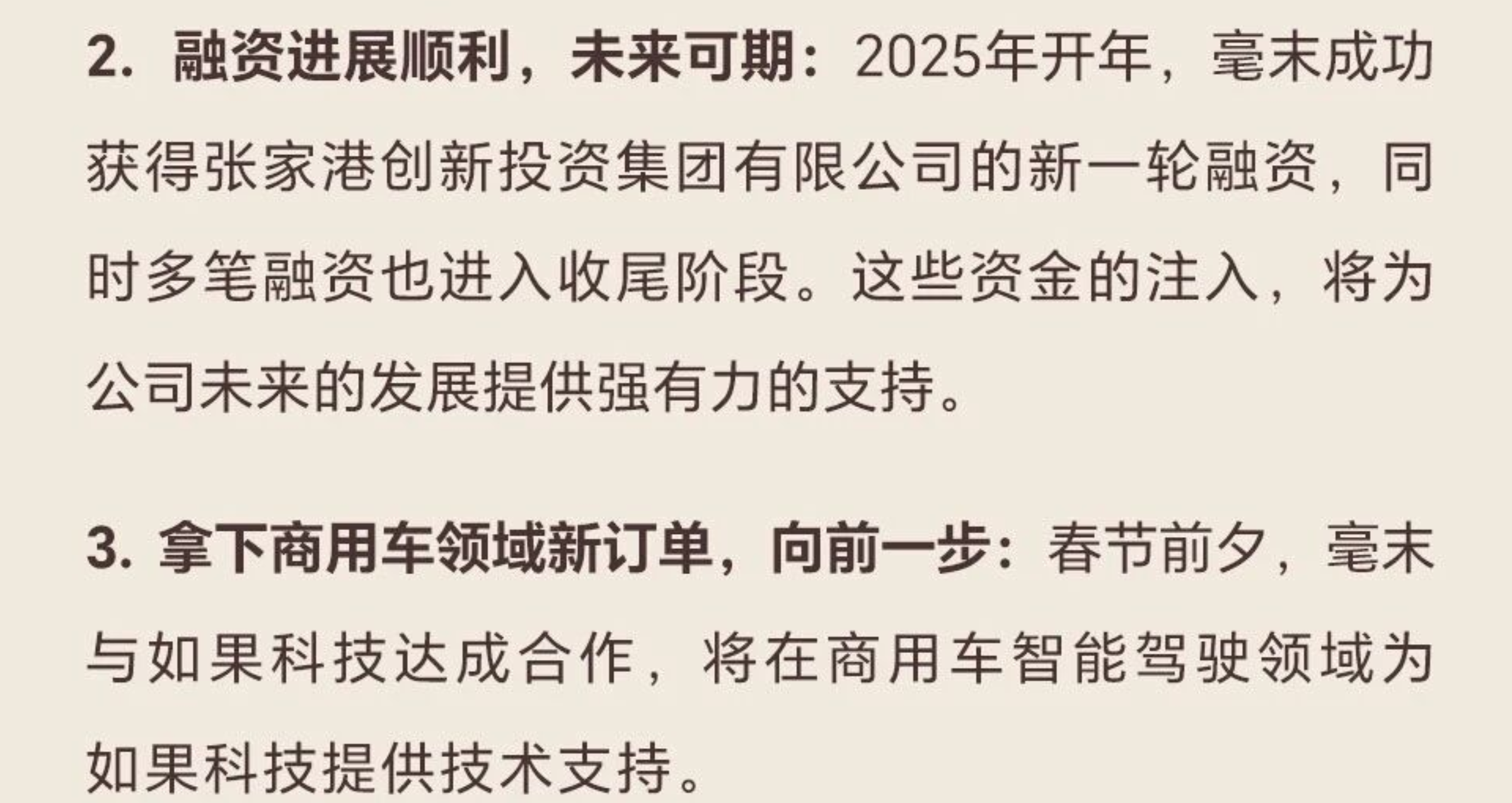而就在2025年开年,毫末智行董事长张凯与CEO顾维灏曾在全员内部信中表示,公司融资进展顺利,未来可期:“2025年开年,毫末成功获得张家港创新投资集团有限公司的新一轮融资,同时多笔融资也进入收尾阶段。”